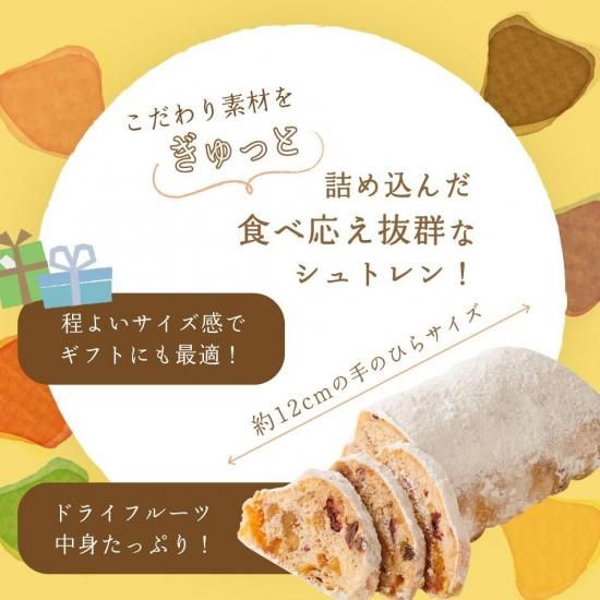 贅沢なひとときを演出する、ドライフルーツと木の実がたっぷり詰まったベーシックなシュトレンです。手土産やプレゼントに最適でありながら、常温で保存可能なので、急な贈り物にも安心です。